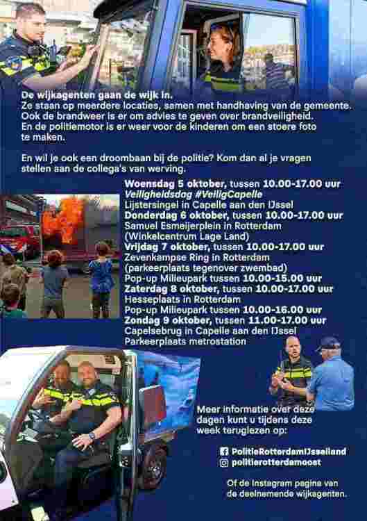 Samen met handhaving komen de wijkagenten de Wijken in District Oost (Prins Alexander en Capelle aan den IJssel) naar de bewoners in de wijken. Op vijf achtereenvolgende dagen kunt u de wijkagenten bezoeken op makkelijk bereikbare plekken zoals winkelcentra en gemeentehuizen. Ook de brandweer is weer aanwezig om advies te geven over brandveiligheid. Daarnaast kun u vragen stellen aan Toezicht en Handhaving en gemeentelijke zaken zoals afval. Voor de kinderen is er weer de politiemotor om een stoere foto op te maken!