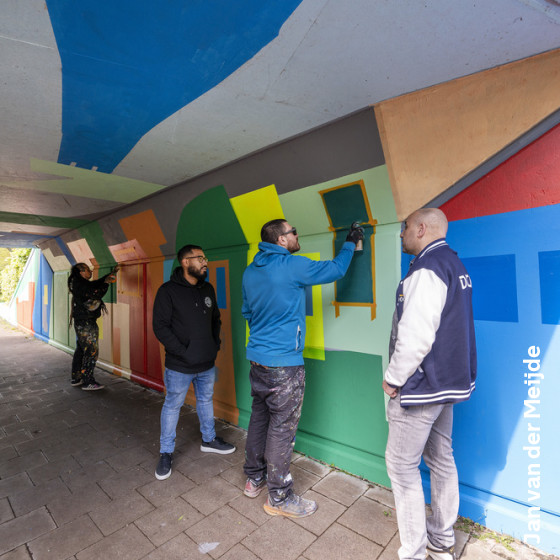 De hele week al zijn de jongeren druk met verf en kwasten in de weer. Ze werken in shifts aan fraaie onderdoorgangen bij het Albert Schweizerpad.