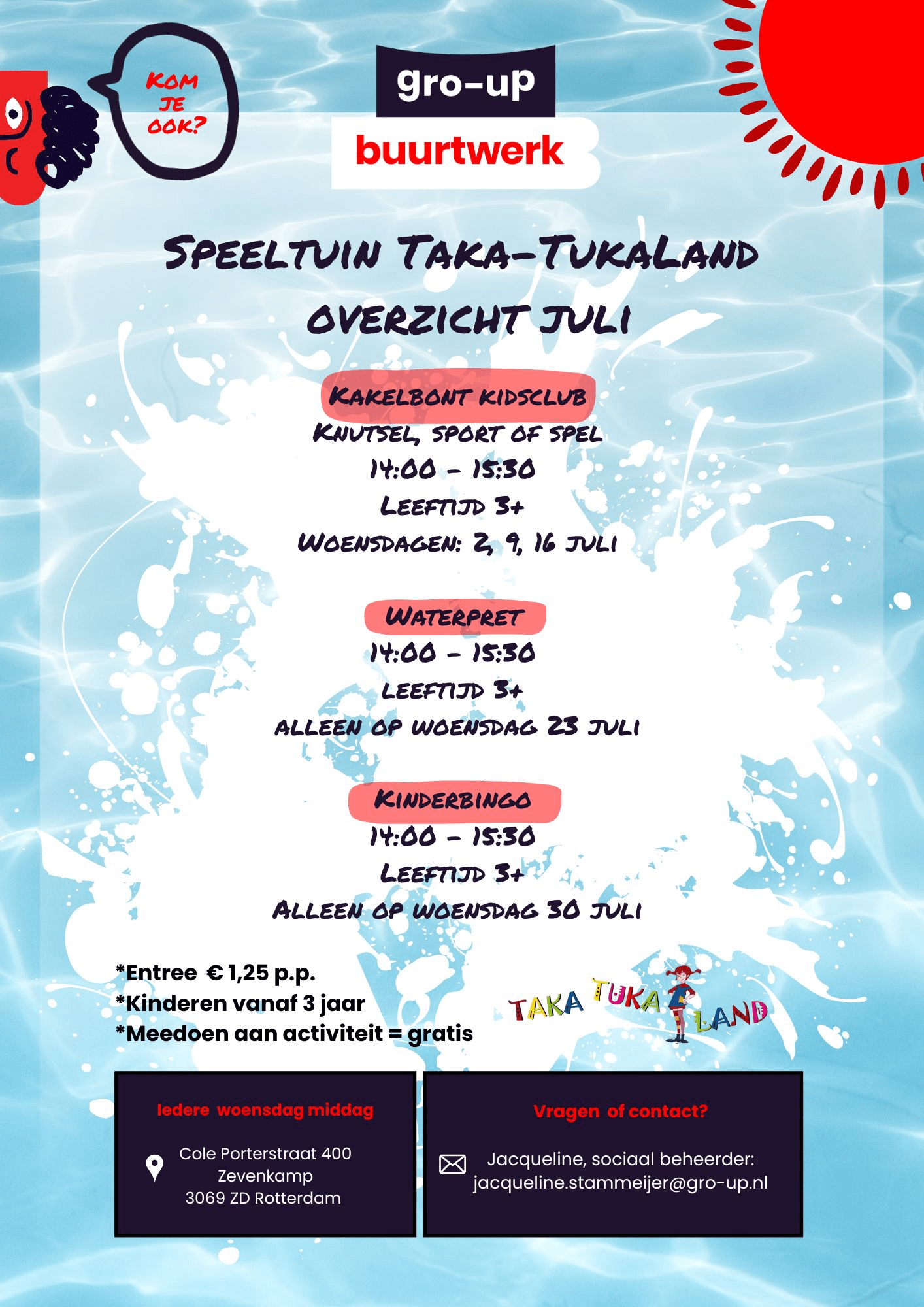 De entree is 1,25 euro per persoon. Diverse activiteiten in juli in Taka Tukaland, Cole Porterstraat 400 in Zevenkamp.